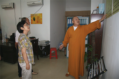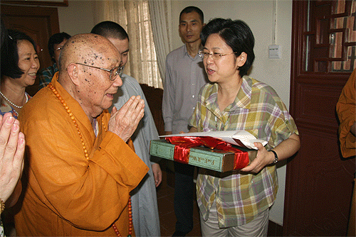 弘法网讯:2008年8月20号,原广东省委统战部副部长,现省人事厅党组书记温兰子一行亲赴深圳弘法寺看望本焕老和尚并祝贺印顺法师荣升弘法寺代理方丈。为感谢温兰子多年对弘法寺的关心指导,印顺法师亲书“南方之子 诸佛护法”对联,同时整理一本自1992年以来,温兰子在弘法寺的照片赠与温兰子。