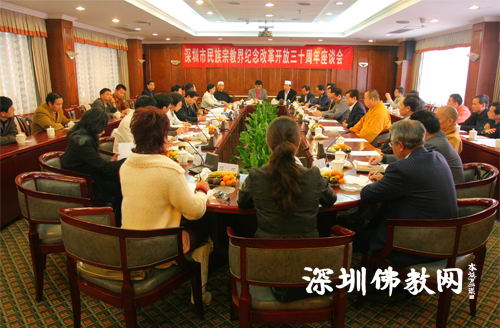 12月16日上午,深圳市民族宗教局召开民族宗教界纪念改革开放30周年座谈会, 市民族宗教局各部门、各区民宗局负责人和民族宗教团体人士代表30余人参加座谈。座谈会由市委统战部副部长、民族宗教局局长冯安群主持。 深圳市佛教协会副会长兼秘书长、弘法寺方丈印顺大和尚代表佛教界在会议上发言。
