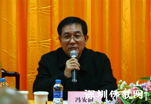 最后,冯安群局长作了讲话。他首先代表市委统战部、市民宗局对市佛协永远名誉会长本焕长老和新当选的会长、副会长和秘书长表示祝贺。他说,今天的会议调整充实了佛协的领导班子,为佛协增添了新的力量,对深圳的佛教事业具有重要意义。接着,他对市佛协的工作提出了五点要求,即一是调整充实后的市佛协领导班子要继续以本焕长老为旗帜,在大家的共同努力下,把佛协的工作做的更好。他肯定了佛协近年的工作取得了很好的成绩,指出譬如今年5.12汶川地震时期的抗震救灾工作就卓有成效,受到了中央统战部、国宗局和深圳市委市政府的肯定,在国内是属于走在前面的。二是希望在座各位常委发挥作用,支持和帮助市佛协开展工作,支持新当选的会长、副会长和秘书长的工作,把佛协的会务、教务开展得有声有色。三是市佛协要进一步加强对深圳各佛教活动场所的建设,以弘法寺已经被国宗局和省民宗委肯定的经验为基础,争取在明年全国的“文明和谐寺院”创建工作中取得好成绩。四是市佛协要继续高举爱国爱教的旗帜,在明年经济形式严峻、社会情况复杂的条件下为维护稳定、构建和谐发挥佛教的积极作用。五是市佛协要以人民利益为重,要积极参与社会公益慈善事业,要发扬佛教慈悲济世的优良传统,为社会经济的发展做贡献。