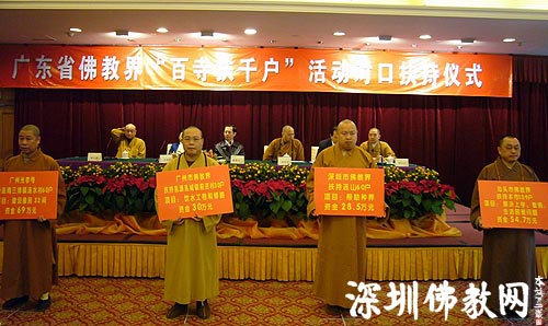 2009-01-15上午,省民族宗教委和省佛教协会在广州举行广东省佛教界“百寺扶千户”活动对口扶持仪式。雷于蓝副省长在仪式上强调,由于受国际金融危机的影响,今年我国经济社会发展将面临严峻的形势,我省宗教界包括佛教界要努力建设和谐宗教,积极关注民生,开展慈善公益事业,为国家分忧,为社会解难。