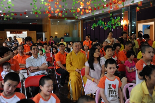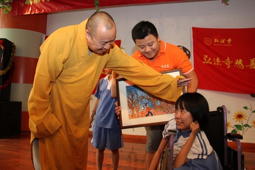 深圳市佛教协会会长、弘法寺方丈印顺大和尚也在百忙中赶来福利中心看望孩子们,并做了开示。他说:“真正的快乐是没有任何附加条件,是发自内心的、能够穿透我们自己和他人的内心世界。我们每一个人的生命都是在不断走向完善,完善并不意味着世故和成熟,所以,今天与其说给我们给小朋友们带来了一台节目,不如说是孩子们来帮助我们唤醒童年的梦,唤醒我们已然沉睡的心灵!希望我们能焕发出生命的真善美,来感染身边的每一个人……”大和尚最后祝福孩子们能够在福利中心清静、安宁、健康地成长。