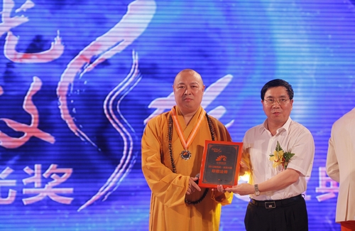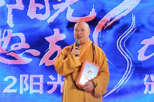 印顺大和尚从深圳广电集团总裁陈君聪的手中接过奖杯。“印顺大师用善举呈现感动,用温暖诠释感恩,他的‘善举’是一种表达方式,更是作为恩泽后世的引导。” 主持人说。