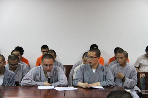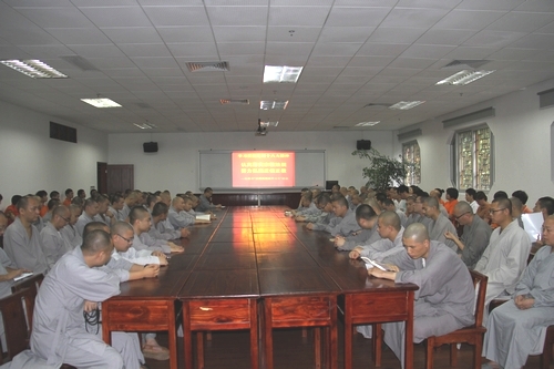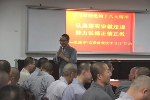 弘法网讯:6月20日下午六点半,弘法寺响应中佛协在全国佛教界开展“宗教政策法规学习月”的号召,组织佛学院全体师生及义工开展落实“学习贯彻党的十八大精神”为主题的宗教政策法规学习活动。