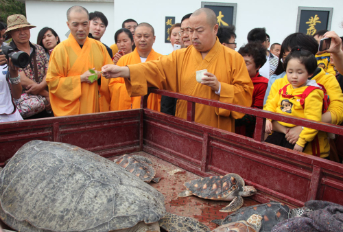 参加此次法会的有十多名法师念佛、诵经、洒净、皈依、回向,庄严肃穆的法会过后,便将海龟放归大海。放生有十大功德:一曰无刀兵劫;二曰集诸吉祥;三曰长寿健康;四曰多子宜男;五曰诸佛欢喜;六曰物类感恩;七曰无诸灾难;八曰得生天上;九曰诸恶消灭,四季安宁;十曰生生息息,永享福寿。