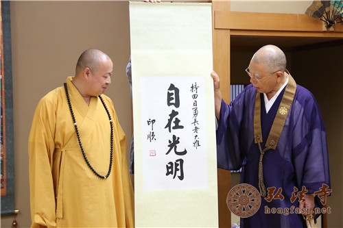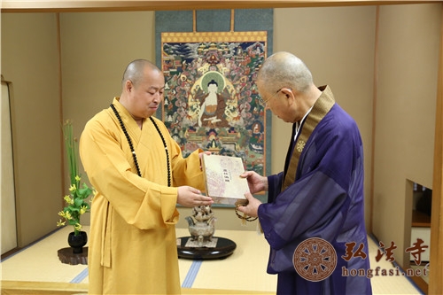 其后,双方交换了礼物,印顺大和尚向恳话会赠送汉传丛林唱念仪轨及其墨宝,持田日勇会长代表恳话会回赠礼物,并合影留念。