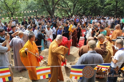上午的盛典在为一代禅门宗师本焕长老、净慧长老的舍利塔奠基仪式后结束,蒋坚永、王立平、张国良、张卓、李福祥、王健、肖占军、刘艳梅、丁立国、李之柔等嘉宾与印顺大和尚、明月法师、常辉法师、延参法师一道为舍利塔奠基。