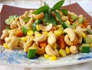 做法:1、玉米煮熟后剥粒;黄瓜和胡萝卜连皮切成丁。2、腰果略用油炸一下,控干后备用。3、起锅热少许油,爆香姜末,先倒入胡萝卜丁炒至七、八成熟后,再放入玉米粒、腰果、黄瓜丁翻炒,最后用盐、蘑菇精调味即可。