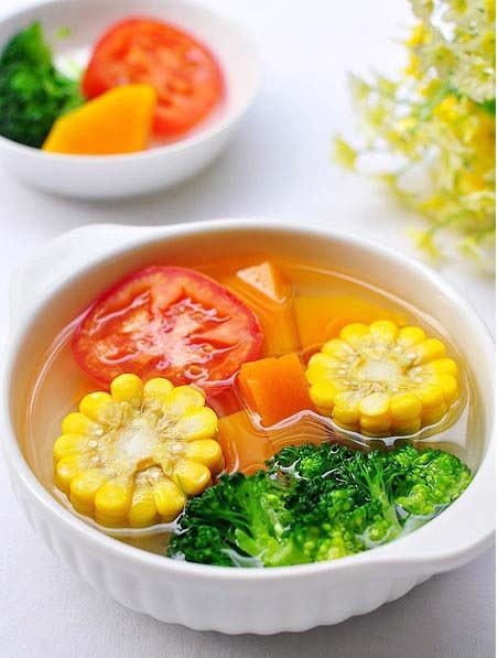 1、南瓜和玉米都需要煮的时间较长,所以要先下锅煮一段时间再下其它蔬菜;