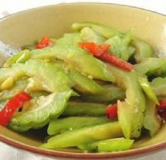 2、起锅热油,倒入苦瓜片用旺火爆炒2分钟,出锅装碟。