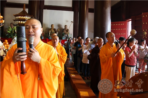 上午9点,浴佛祈福法会在南山寺金堂举行。智法法师带领僧俗两众诵经、浴佛。浴佛偈云:“我今灌沐诸如来,净智庄严功德聚;五浊众生令离垢,同证如来净法身。”当我们借着一匙香花净水灌沐佛身的时候,同时也是灌沐我们自己的心灵,这是浴佛仪式真正的意义所在。正所谓:“外沐佛身,內净自心”,远离了尘垢,保持内心念念分明,时时清净。