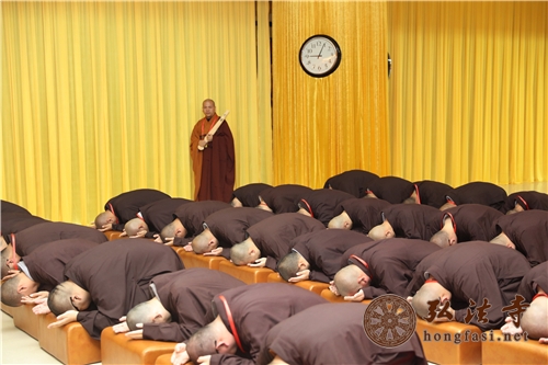 上午8时许,众戒子齐聚弘法寺经堂,聆听开堂大师父开示,然后戒子三人一组,在佛前对引礼师父致诚发露忏悔前愆,余下戒子则礼佛拜愿,虔诚忏悔三业。